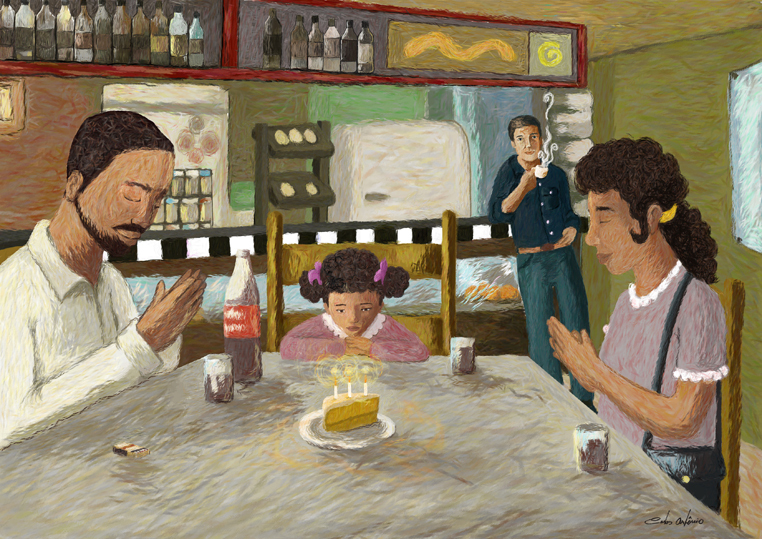 São três velinhas brancas, minúsculas, que a mãe espeta caprichosamente na fatia do bolo. enquanto ela serve a Coca-Cola, o pai risca o fósforo e acende as velas. Como a um gesto ensaiado, a menininha repousa o queixo no mármore e sopra com força, apagando as chamas. Imediatamente põe-se a bater palmas, muito compenetrada, cantando num balbucio, a que os pais se juntam, discretos: “Parabéns pra você, parabéns pra você…” Depois a mãe recolhe as velas, torna a guardá-las na bolsa. A negrinha agarra finalmente o bolo com as duas mãos sôfregas e põe-se a comê-lo. A mulher está olhando para ela com ternura – ajeita-lhe a fitinha no cabelo crespo, limpa o farelo de bolo que lhe cai ao colo. O pai corre os olhos pelo botequim, satisfeito, como a se convencer intimamente do sucesso da celebração. Dá comigo de súbito, a observá-lo, nossos olhos se encontram, ele se perturba, constrangido – vacila, ameaça abaixar a cabeça, mas acaba sustentando o olhar e enfim se abre num sorriso.